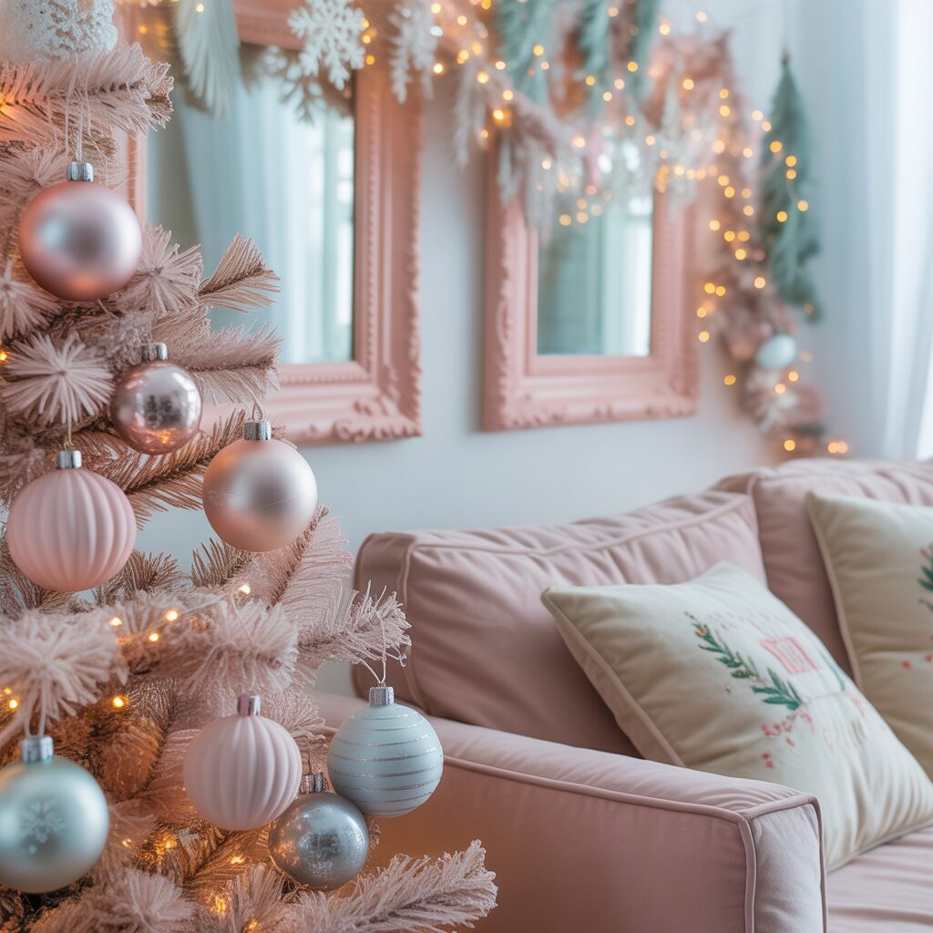 Soft pinks, blues, and creams with holiday accents create a gentle and elegant vibe. Pastel trees, ornaments, and snowflakes make your screen feel cozy yet stylish.