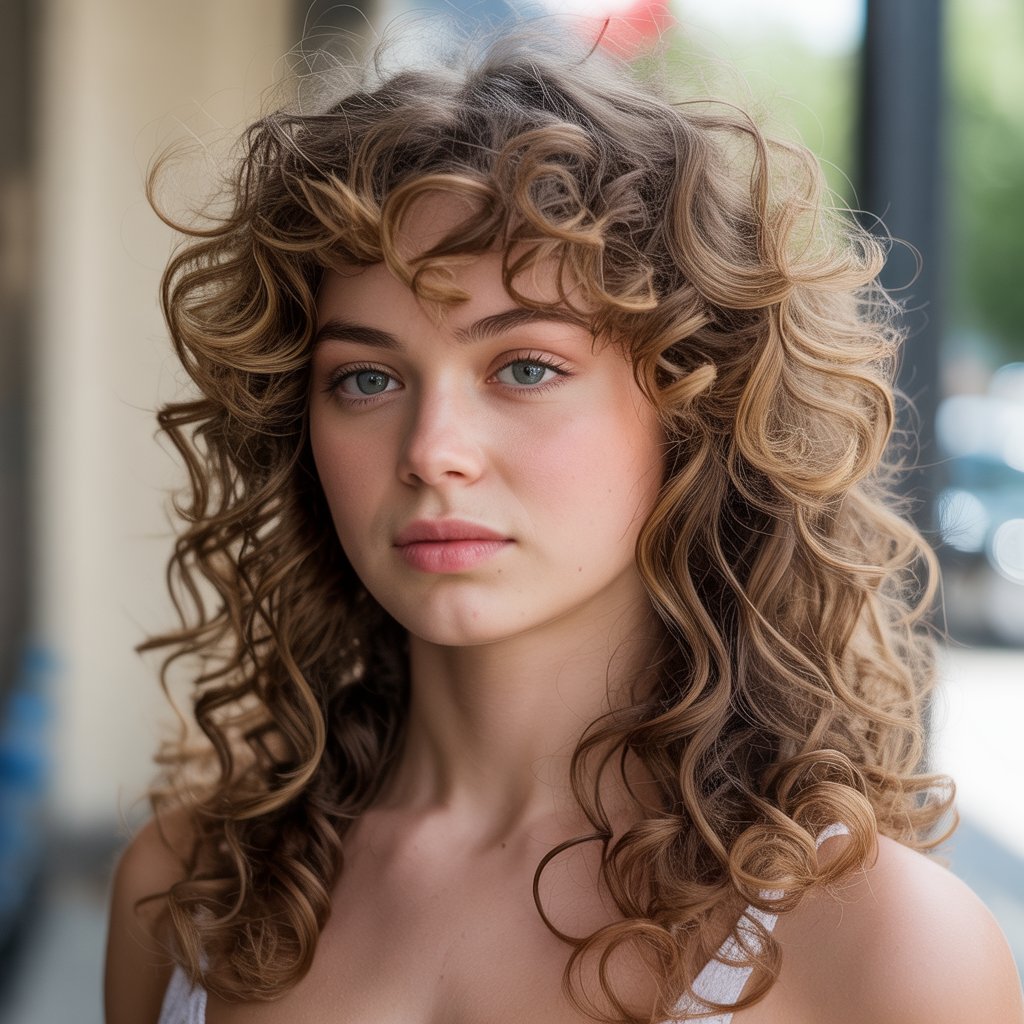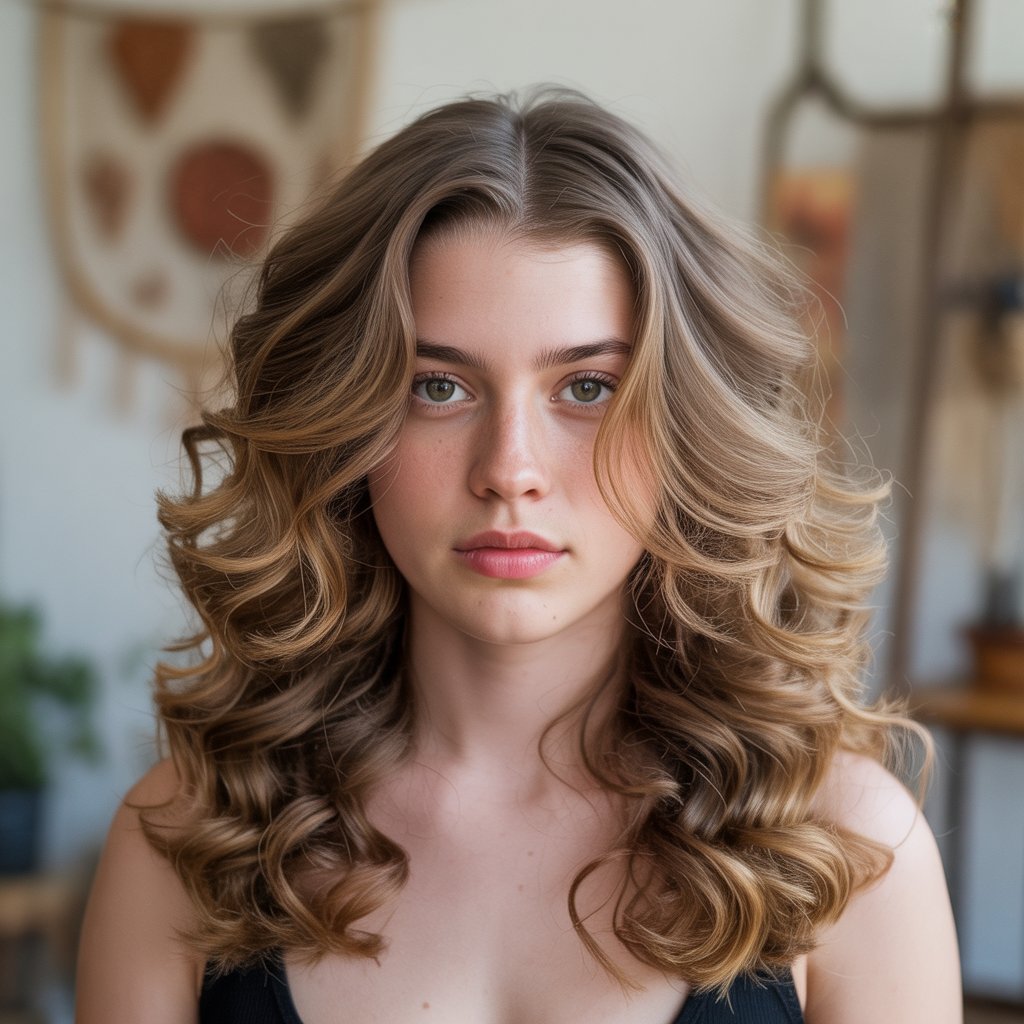 How it’s created: Hair is parted down the middle, styled with loose curls or waves using a curling iron, and finished with a texturizing spray for natural bounce.