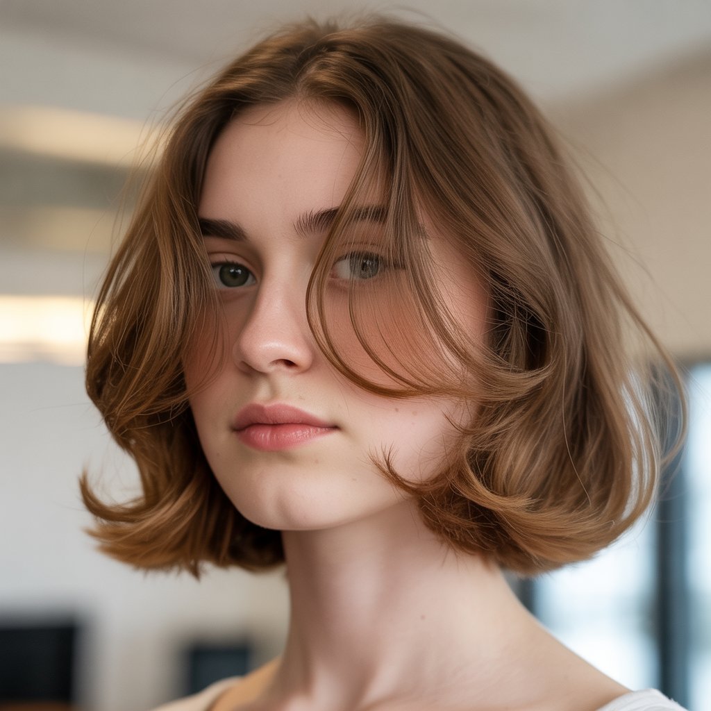 Why it’s different: Side-swept bangs cut across the forehead diagonally, visually shortening it. When paired with waves, they add width to the sides, balancing the long face. Unlike center parts, this style shifts focus to the eyes and cheekbones.
