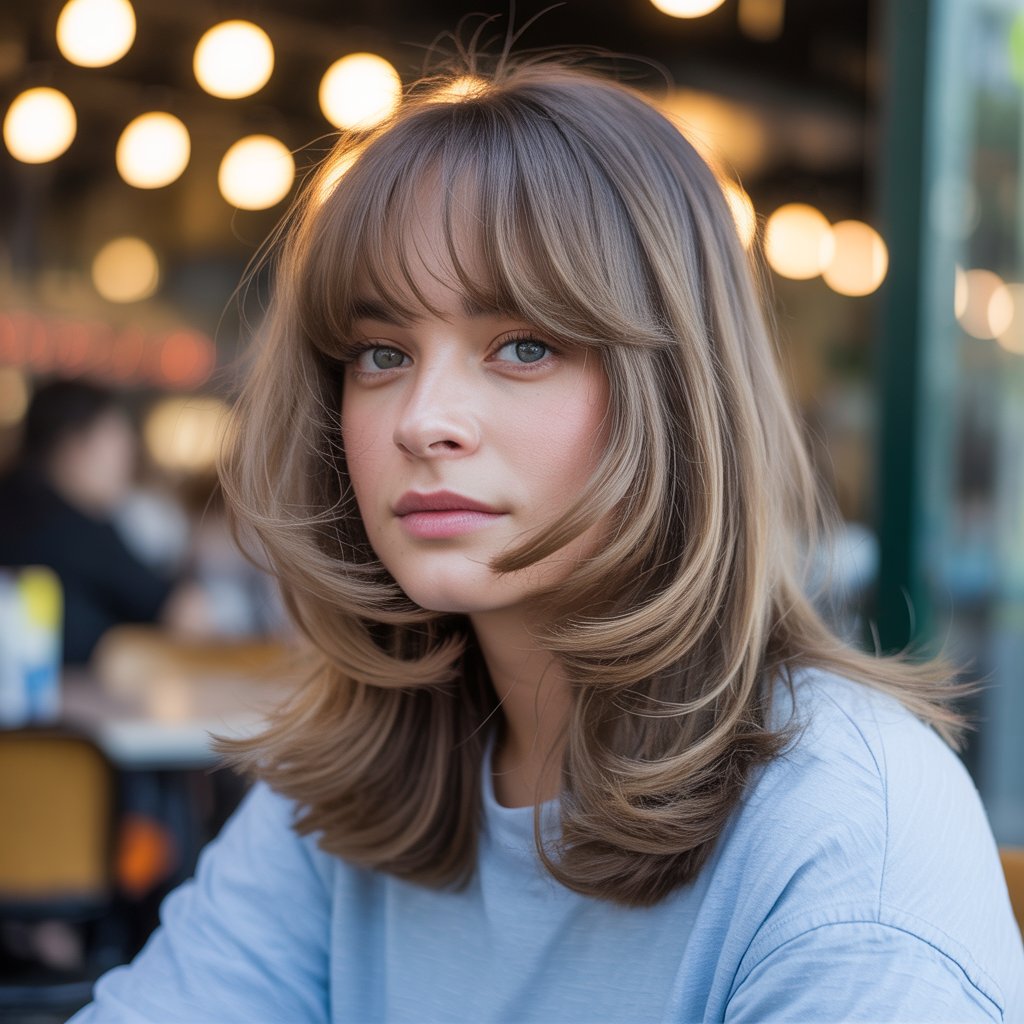 How it’s created: The bangs are cut to part in the middle, with longer strands on the sides that blend into layered hair. Blow-drying with a round brush creates a soft, face-framing effect.