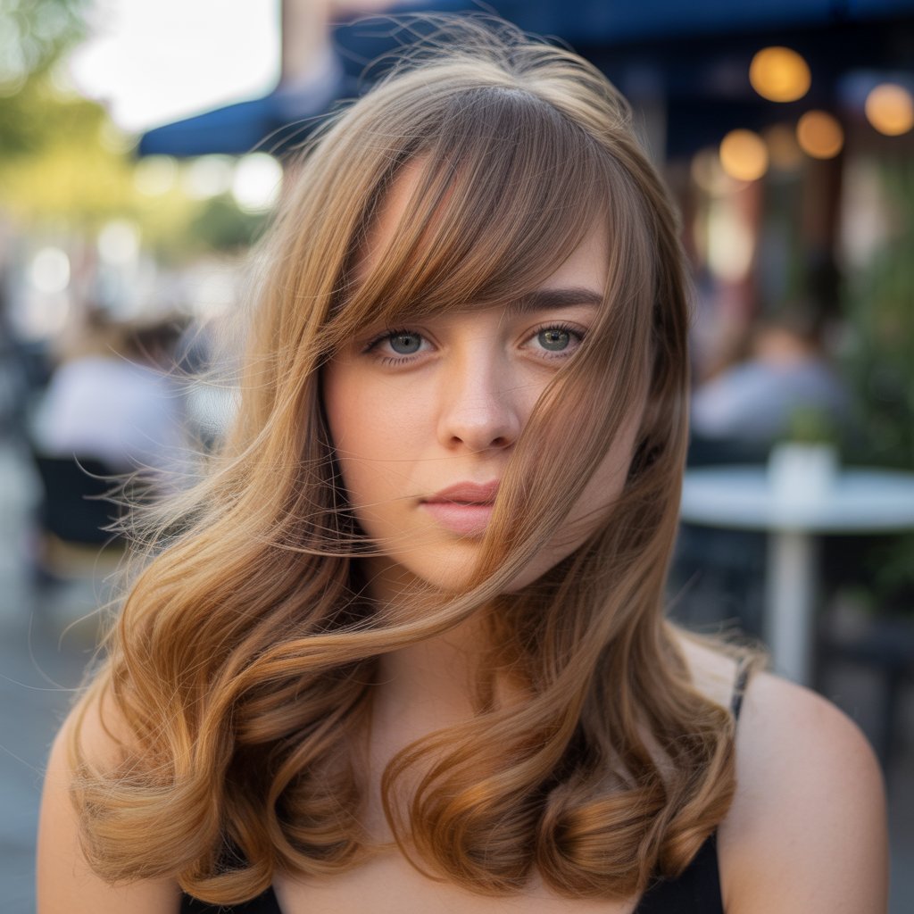 How it’s created: Bangs are cut to sweep to one side, blending into the rest of the hair. Styling involves blow-drying bangs sideways and adding soft curls or waves to the rest.