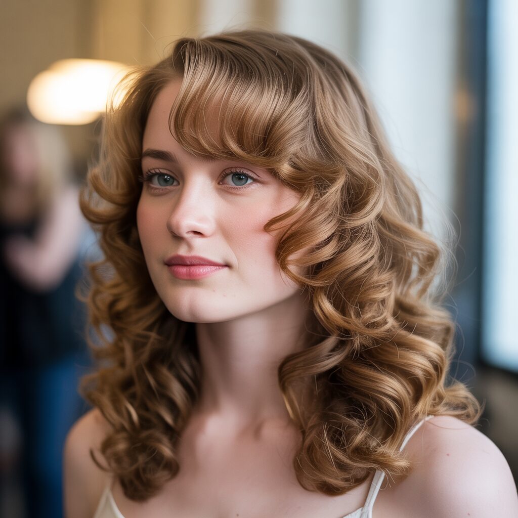 How it’s created: Hair is cut with layers around the face and styled with a curling iron or rollers. A deep side part directs attention diagonally, softening the face.