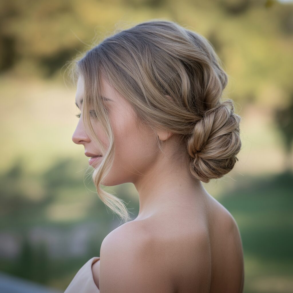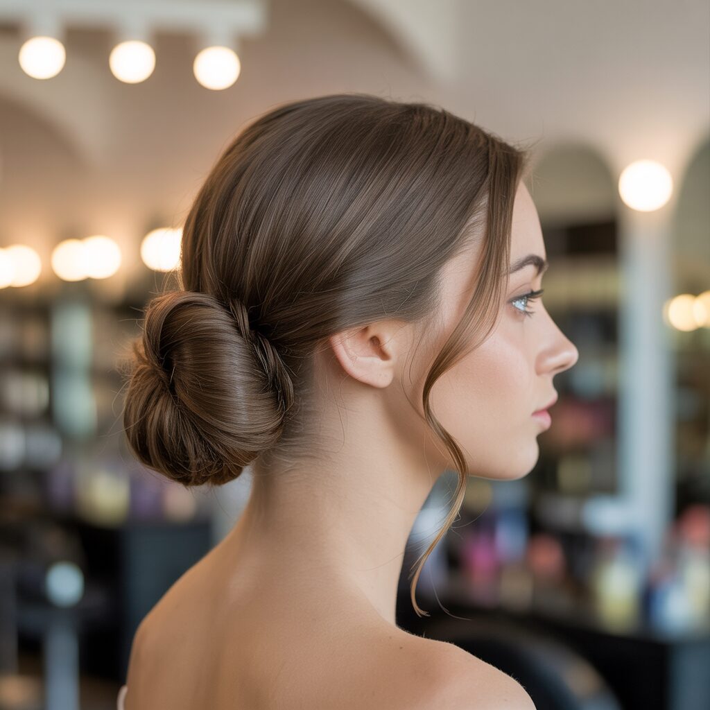 How it’s created: Hair is gathered low at the nape of the neck, twisted, and pinned into a smooth bun. Variations include sleek or messy finishes.