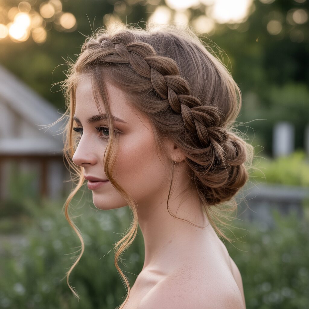 How it’s created: Hair is braided along the hairline or crown and secured into an updo. Loose tendrils are often left out for softness.