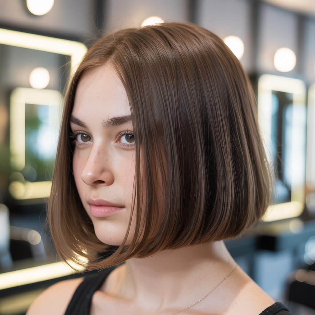 How it’s created: Hair is cut to one length, usually at the jaw or chin. Blow-drying straight with a smoothing serum gives a sleek, fuller effect.