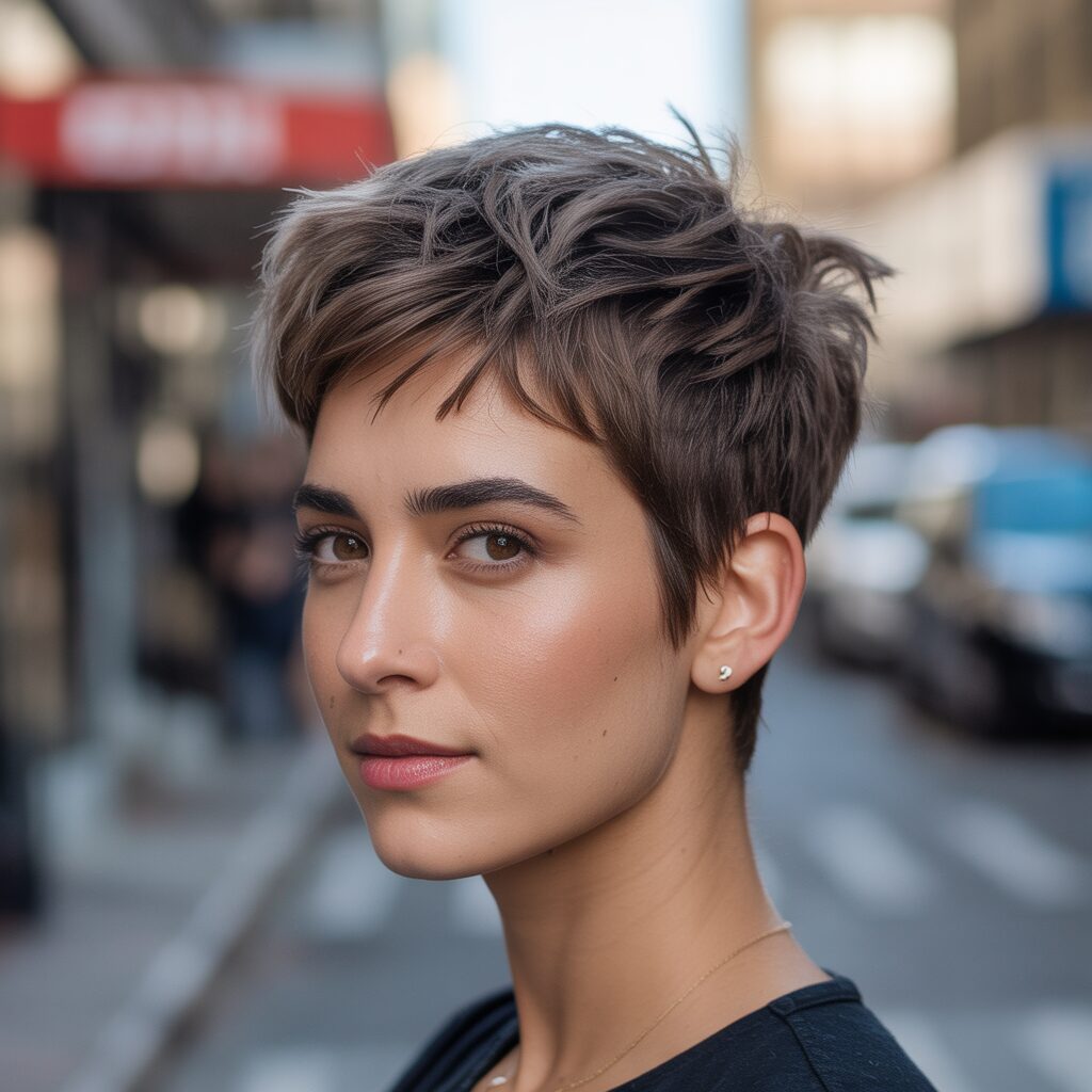 How it’s created: Hair is cropped close on the sides and back, with uneven layers left on top. Styling wax or mousse enhances the texture.