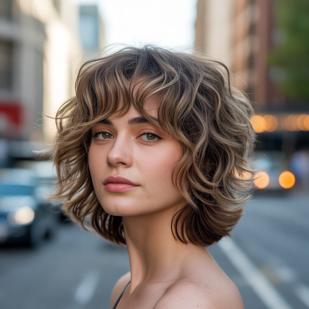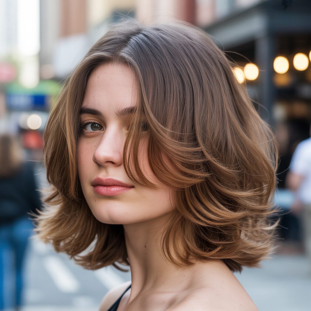 How it’s created: Hair is trimmed just above the shoulders with light, blended layers. A curling iron or round brush adds soft waves for volume.