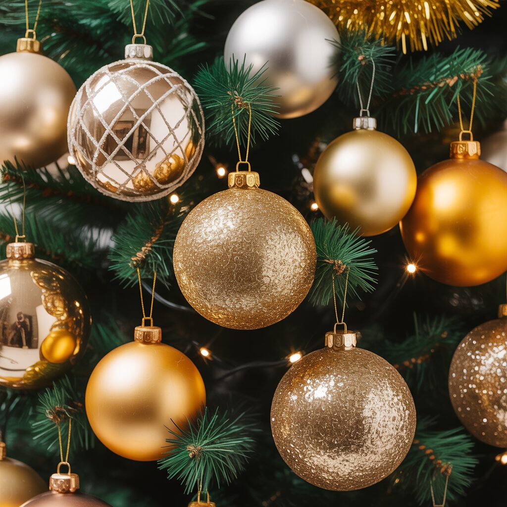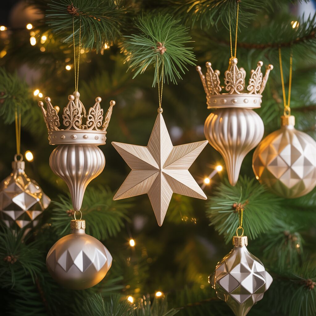 Incorporate crowns, stars, or geometric designs in gold. These ornaments elevate the tree’s sophisticated and luxurious vibe.