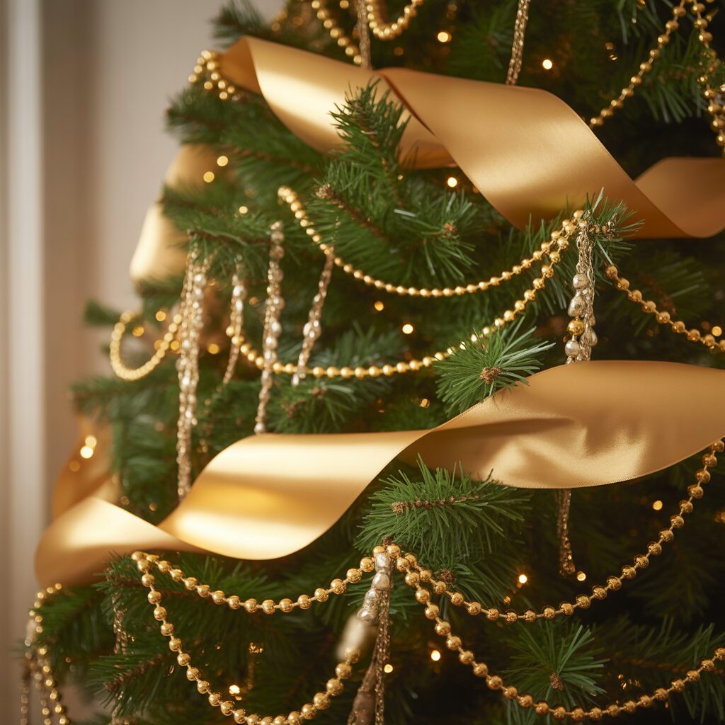Incorporate gold ribbon, garlands, or bead strands. Metallic accents enhance the tree’s elegance and add a cohesive shimmer throughout.