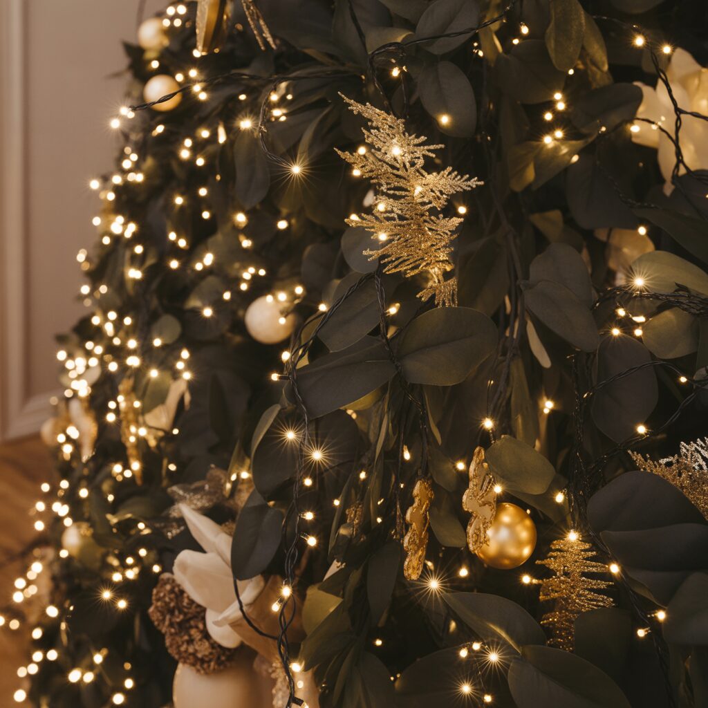 Use warm white or gold LED lights. Soft lighting enhances the gold decorations and highlights the dramatic black foliage.