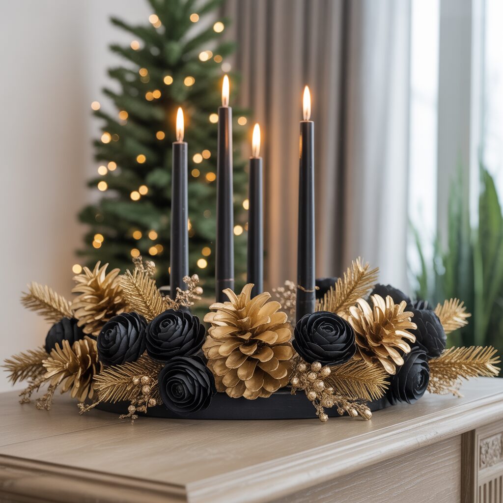 Add gold-painted pinecones or black faux florals. Combining natural elements with glam details enhances the richness of the décor.
