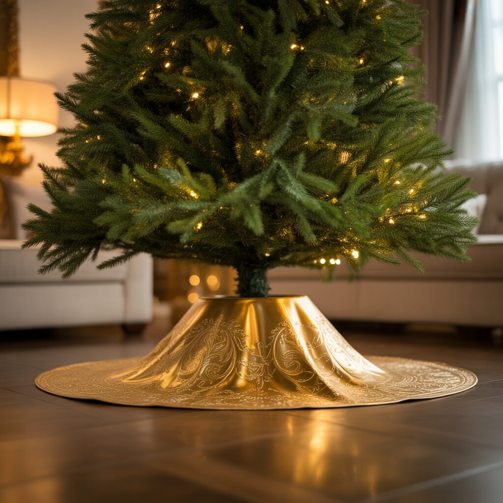 Use a gold or black tree skirt or decorative container. A stylish base anchors the tree and completes the bold, elegant theme.