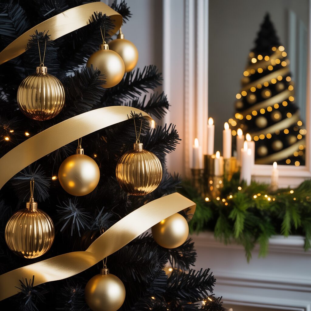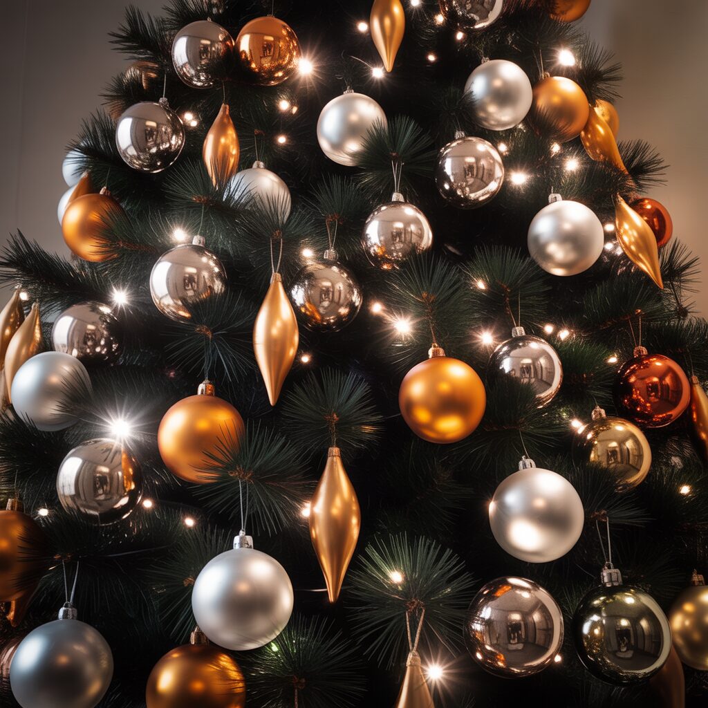 Silver, bronze, or copper ornaments shine brilliantly against black branches. Metallic touches add sparkle and glamour, making the tree a bold centerpiece.