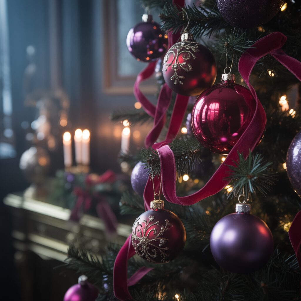 Incorporate deep red, burgundy, and purple ornaments for a dramatic, moody aesthetic. This style adds depth and sophistication to your holiday décor.
