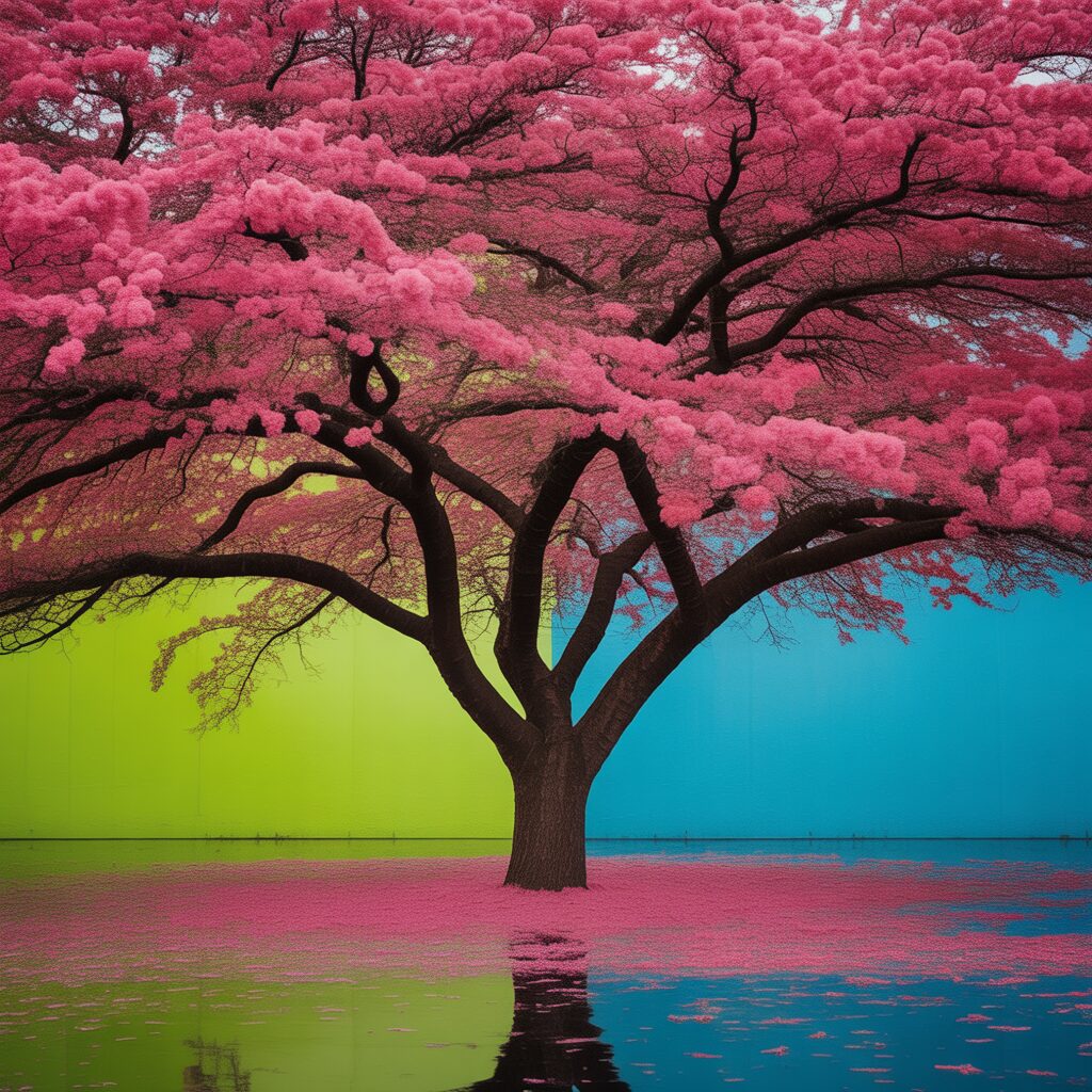 Use bright colors like neon pink, turquoise, or lime green for a fun and playful look. The contrast with the black tree creates a vibrant, energetic atmosphere.