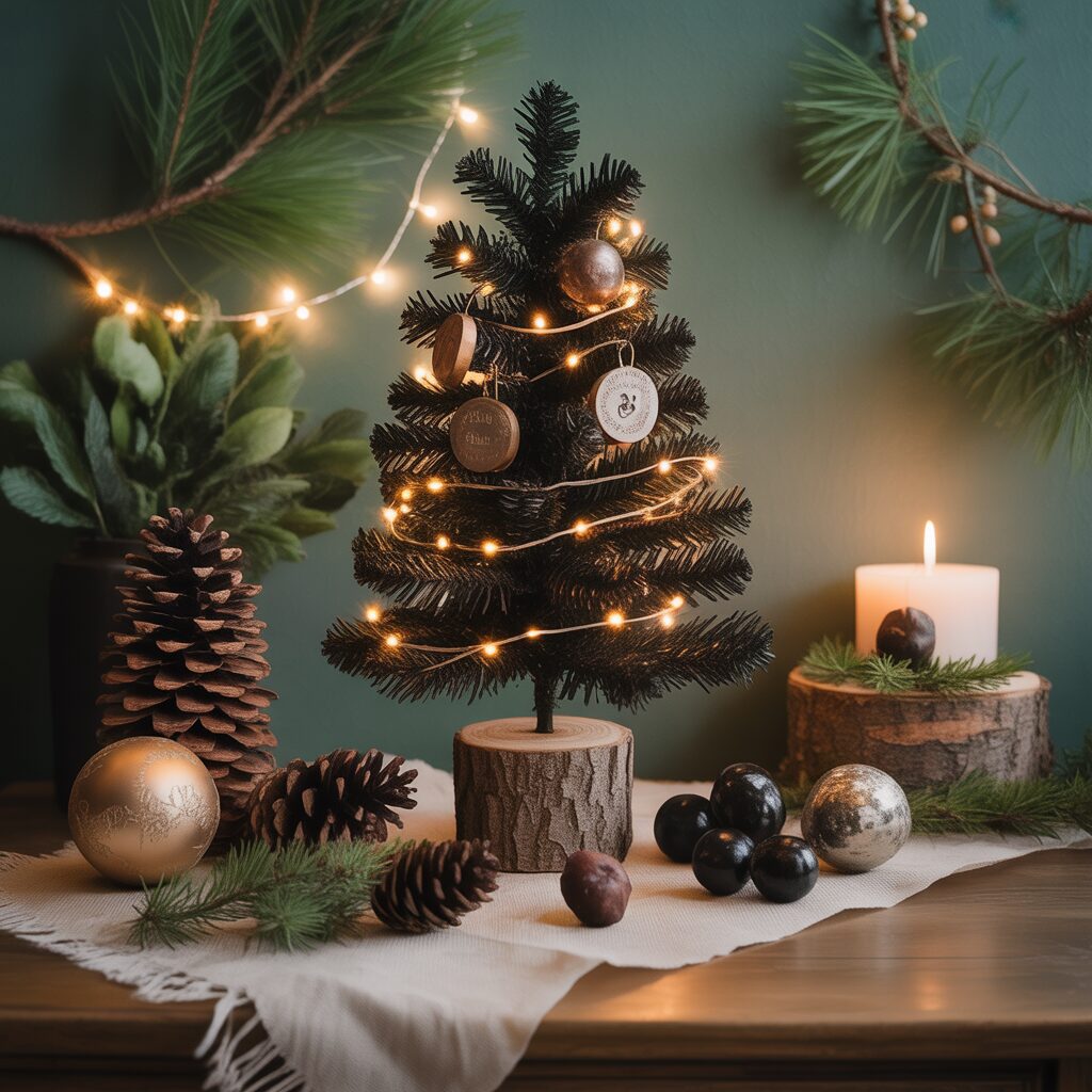 Add natural accents such as pinecones, dark berries, and wooden ornaments. This theme combines rustic charm with the dramatic effect of a black tree.
