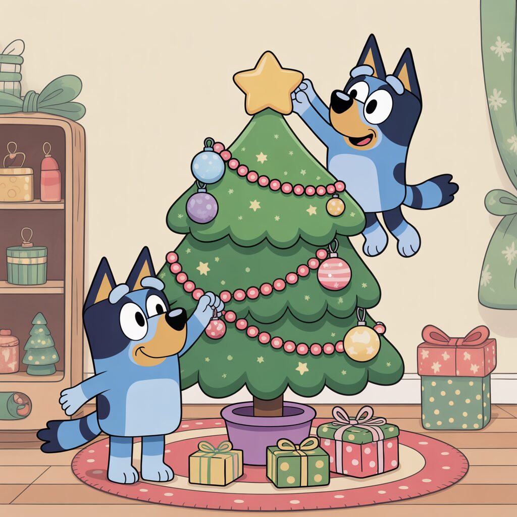 Wallpapers of Bluey and Bingo hanging ornaments or placing a star on the tree are playful and heartwarming. These designs capture the excitement and fun of holiday traditions.
