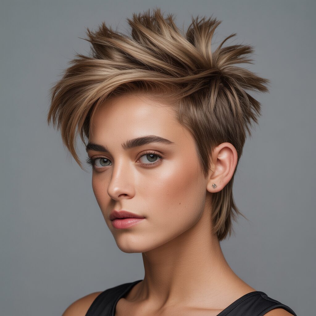 The faux hawk adaptation allows women to play with Brad Pitt’s spiky volume while adding a distinctly feminine edge. Unlike the traditional mohawk, it’s less extreme, keeping the sides shorter and the top messy and voluminous. This style draws inspiration from punk rebellion, representing strength, confidence, and individuality—making it perfect for women who want a strong, fearless look.