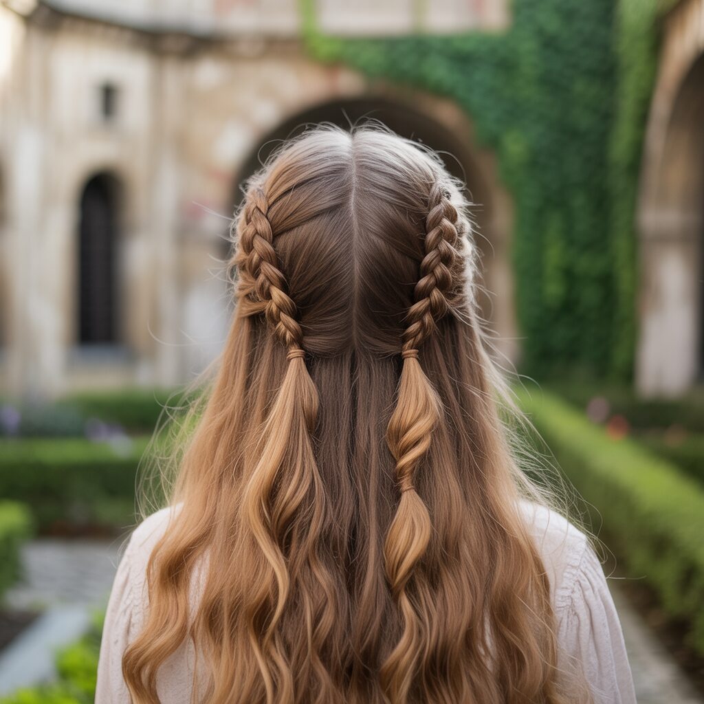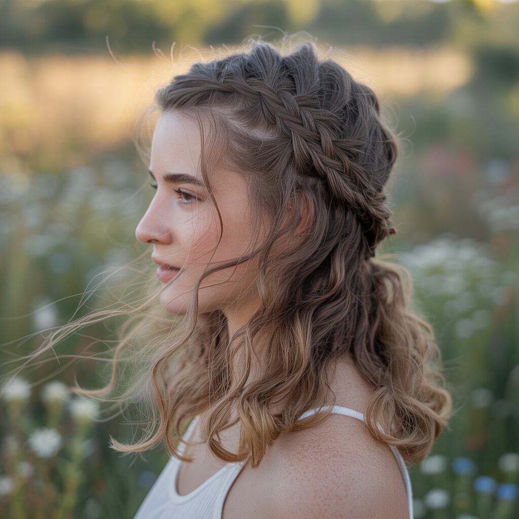 The classic version of this hairstyle combines simple three-strand braids at the crown of the head with loose hair flowing down. Unlike a fully braided style, it maintains softness and movement. This look is inspired by traditional European and medieval hairstyles, where women braided only sections of their hair for everyday wear and elegance.