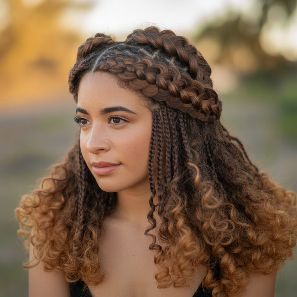 This look incorporates thicker braids at the top while leaving voluminous curls or waves down. Unlike smaller or tighter braids, goddess braids emphasize boldness and structure. This style is deeply rooted in African heritage, where braids have long represented cultural identity, beauty, and tradition.