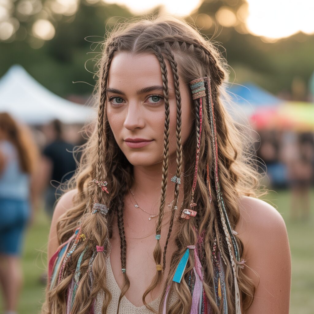 Designed for music festivals and creative gatherings, this version often includes colorful extensions, beads, or glitter woven into the braids. What makes it unique is the playful and artistic detail that transforms hair into a statement accessory. It is inspired by modern festival culture, blending traditional braiding techniques with bold, contemporary self-expression.