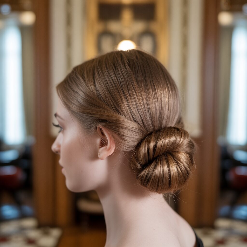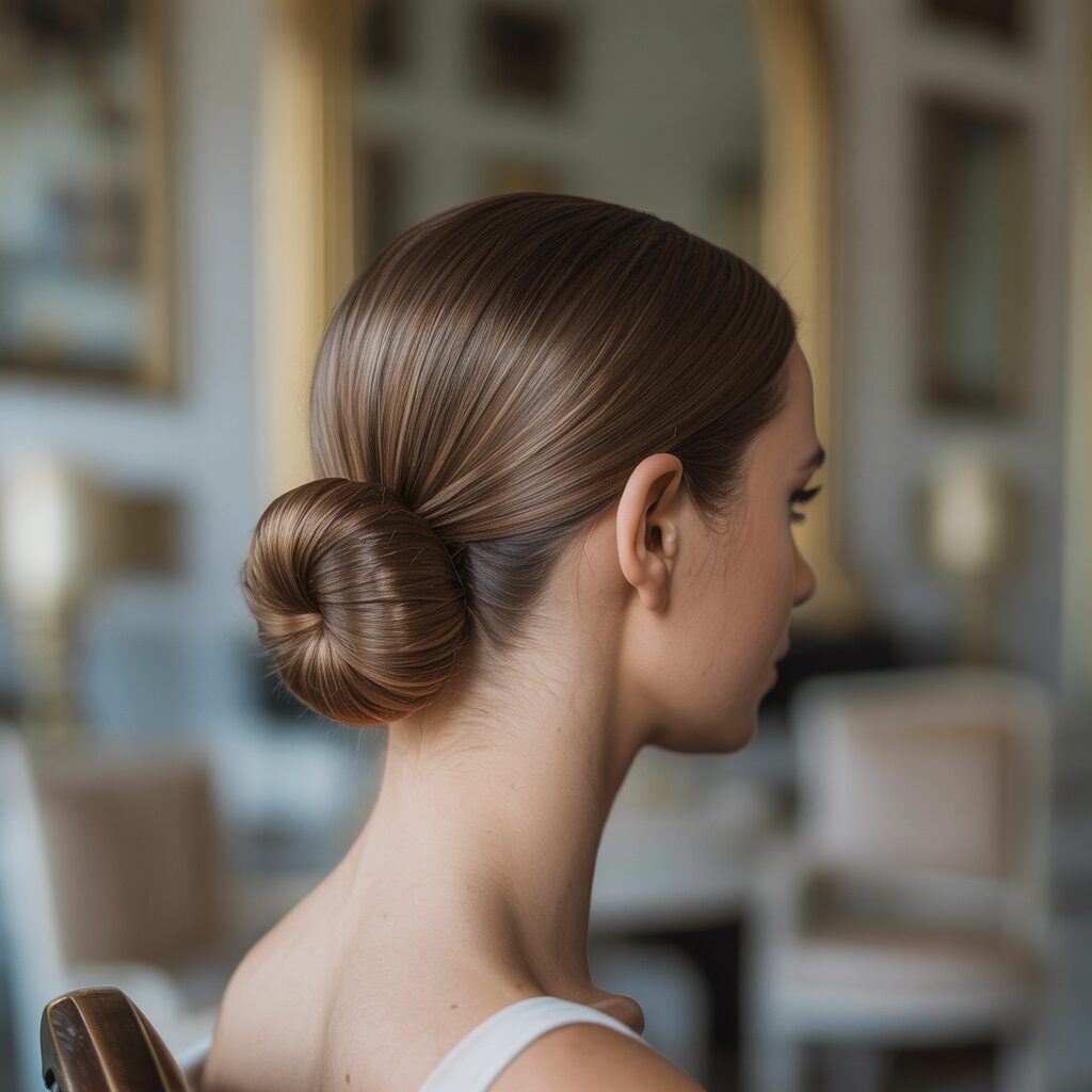 A low bun with a side part creates a polished, sophisticated look. Unlike high buns that emphasize volume, this style highlights simplicity and structure. Its inspiration comes from classic European hairstyles often seen in vintage fashion, where sleek low buns symbolized elegance and refinement.