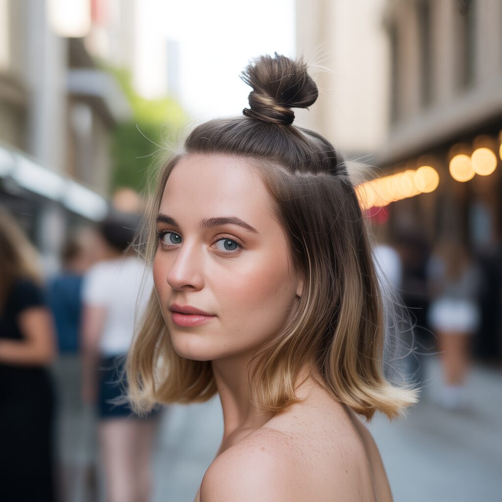 The messy bun is a relaxed and effortless hairstyle that works perfectly even with short hair. Unlike sleek buns, this look embraces natural texture and loose strands for a casual, carefree vibe. It is inspired by French street style and the “undone beauty” trend, making it ideal for everyday wear or quick styling.