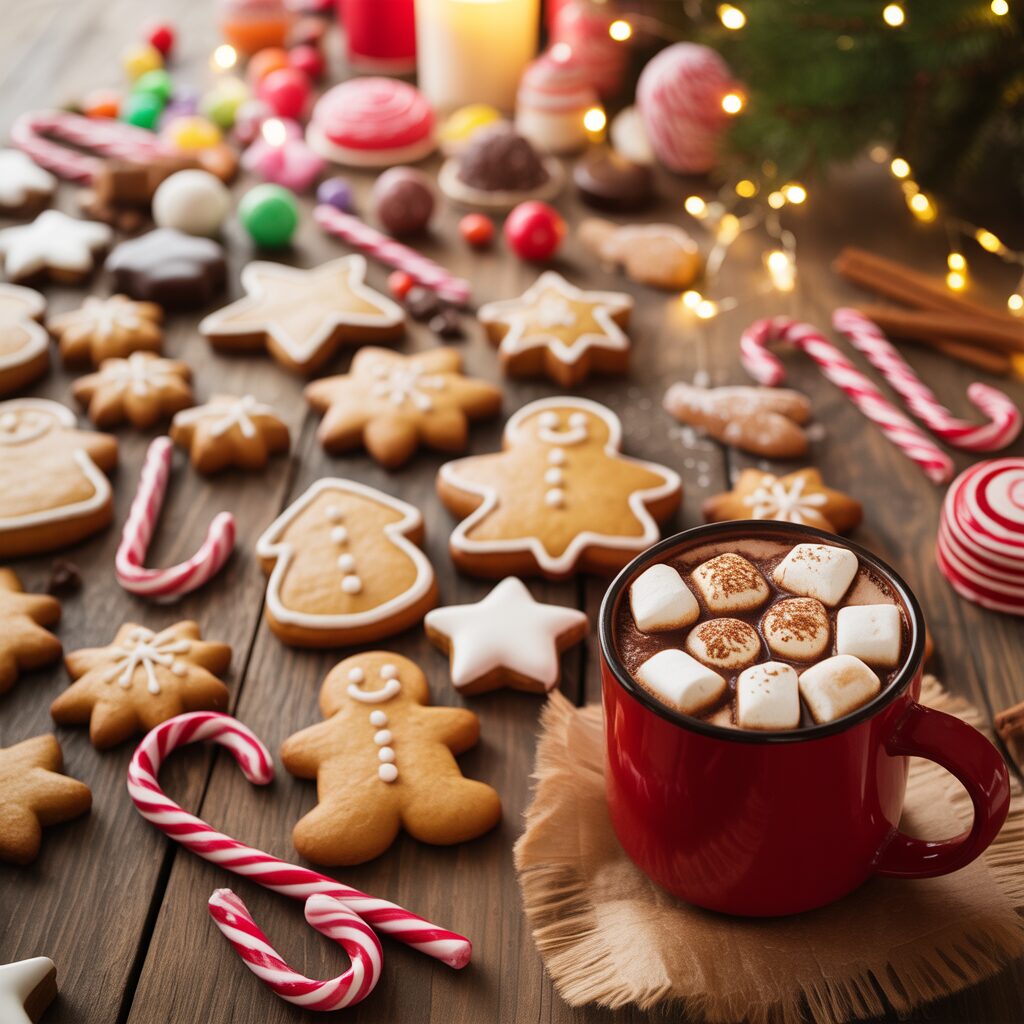 Gingerbread cookies, candy canes, hot cocoa, and festive treats create a sweet and playful aesthetic. These images celebrate the delicious and joyful side of Christmas.