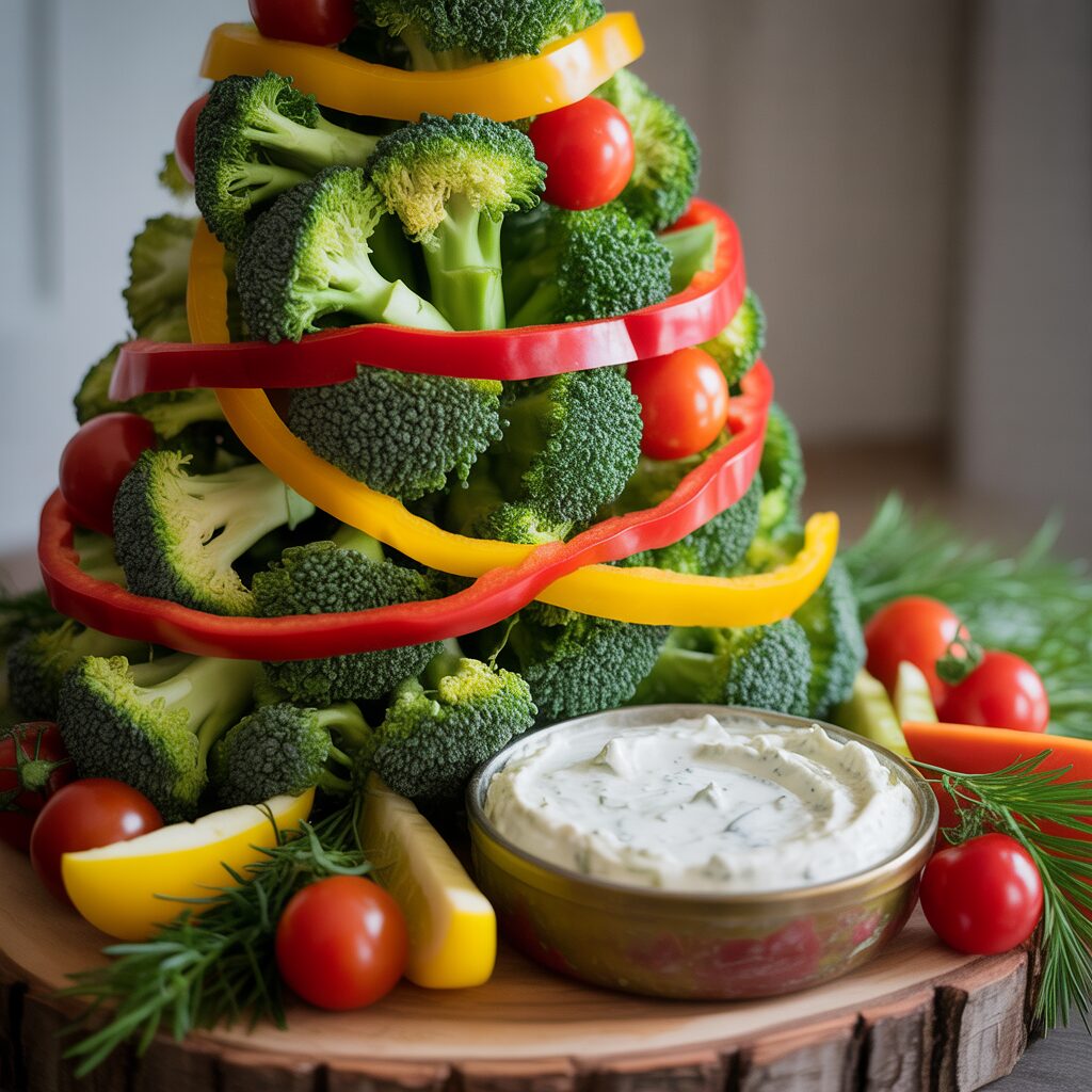 Arrange broccoli, bell peppers, and cherry tomatoes in a tree shape. Serve with a dip base for a healthy and colorful appetizer.