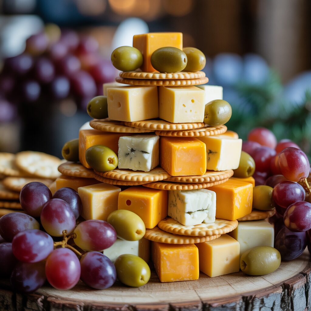 Stack cheese cubes and crackers in a triangular shape. Add grapes or olives as decorations for a visually appealing, easy-to-assemble option.