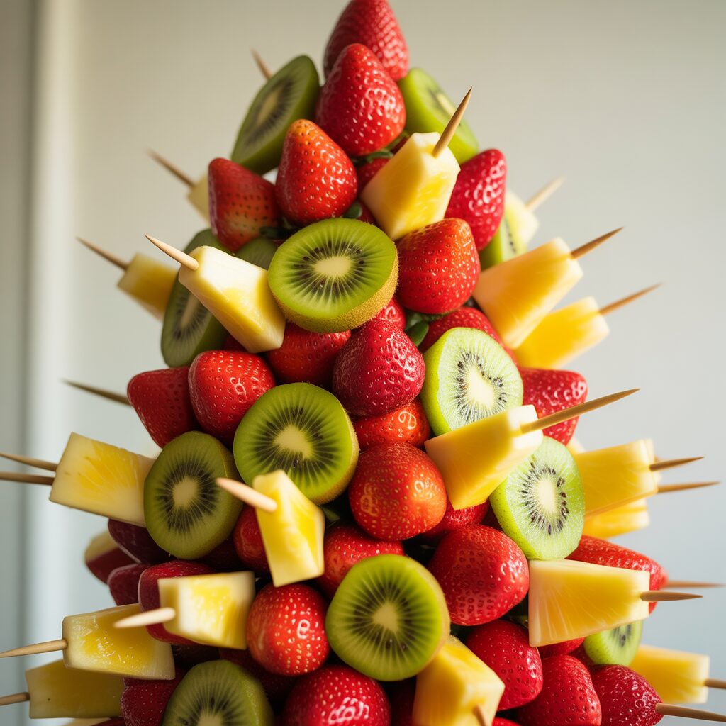 Use skewers or a cone base to create a tree with strawberries, kiwi, and pineapple. Fruit trees are fresh, vibrant, and naturally sweet.