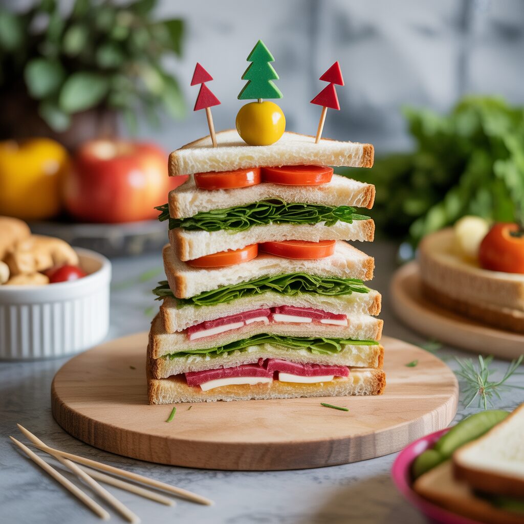 Cut sandwiches into small triangles and layer them in a tree formation. Add toothpick decorations or small veggies to enhance the festive look.