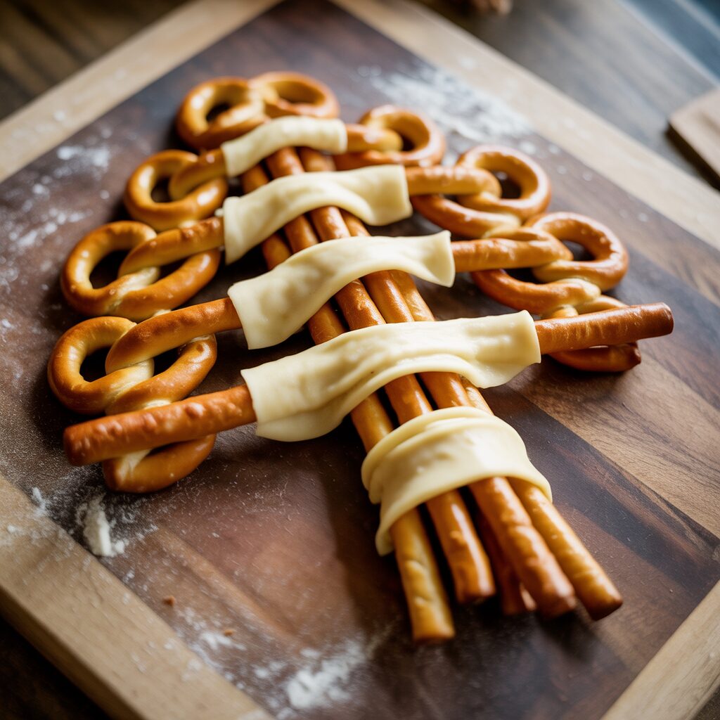 Use pretzels or breadsticks to form a tree shape and wrap with string cheese or edible ribbons. This crunchy option adds texture and flavor variety.