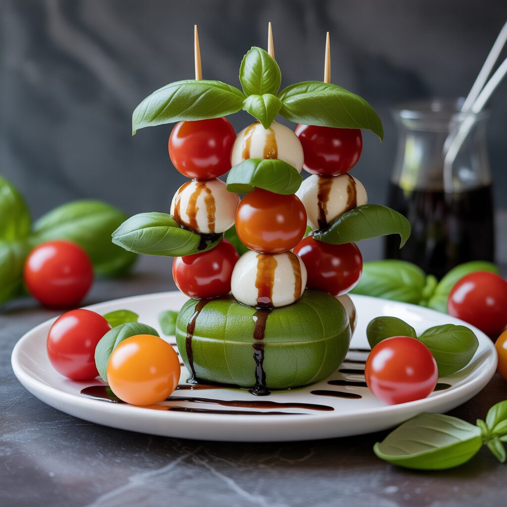 Stack cherry tomatoes, mozzarella balls, and basil leaves on skewers. Drizzle with balsamic glaze for a delicious and visually appealing appetizer.