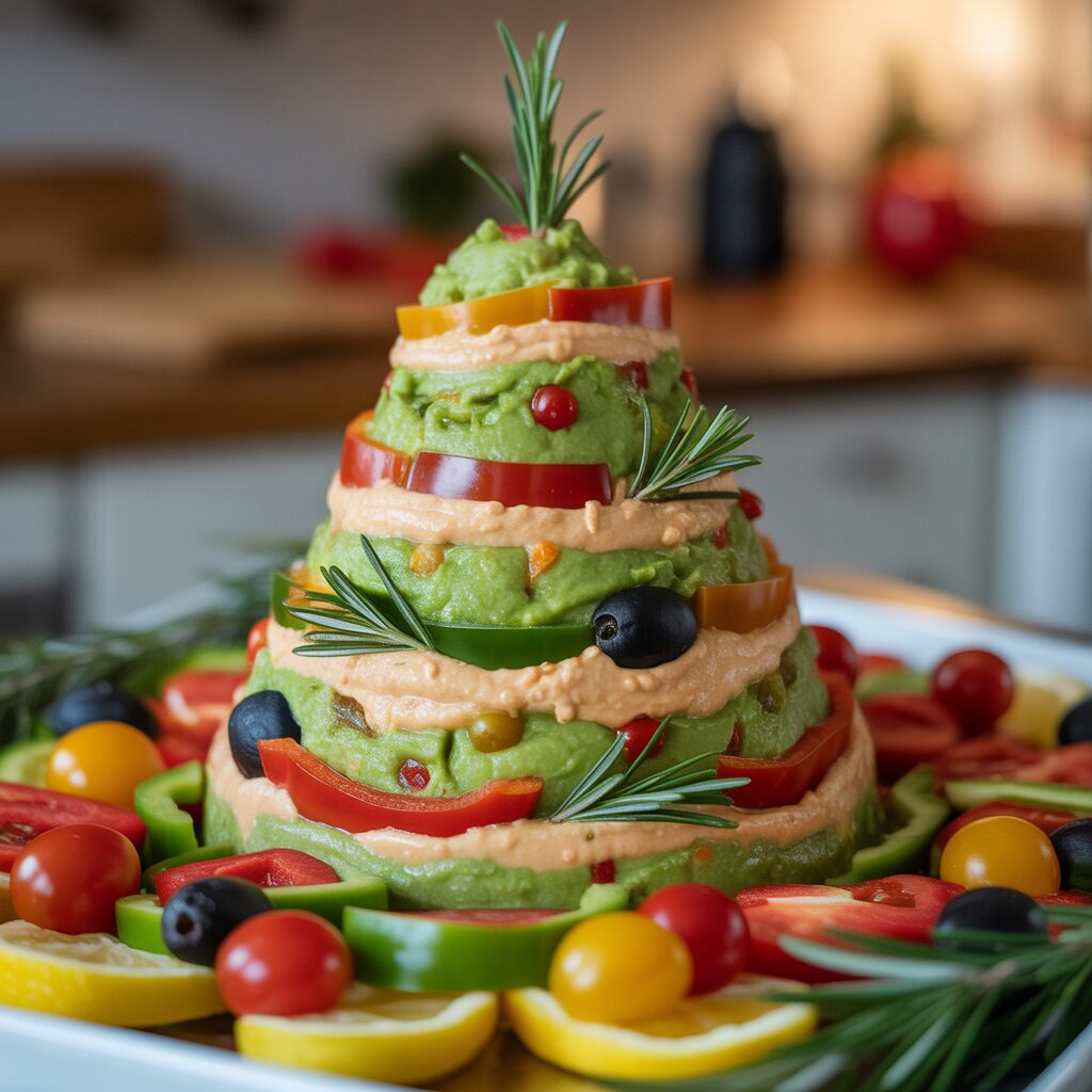 Create a tree-shaped mound of guacamole, hummus, or layered dip. Decorate with colorful veggies, olives, or herbs for a festive touch.