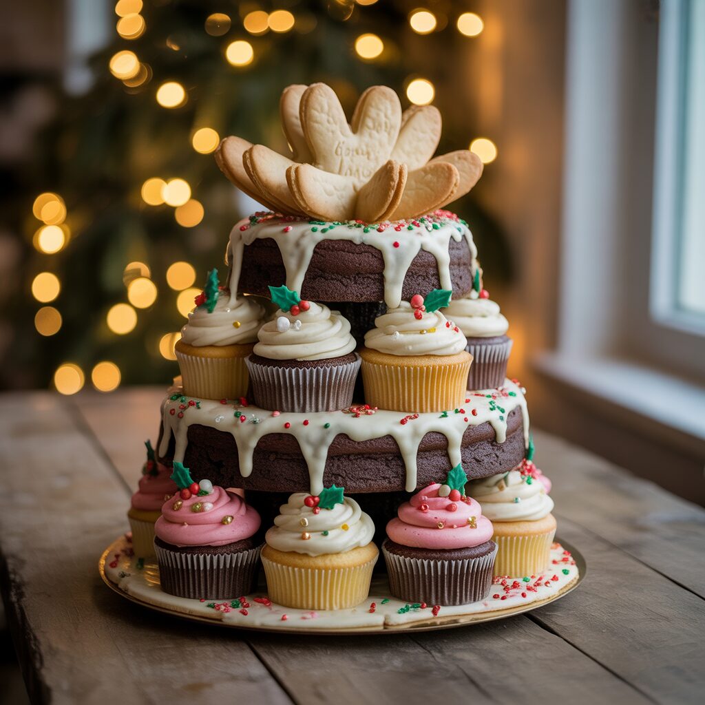 Stack cookies, brownies, or cupcakes in a tree shape. Add frosting, sprinkles, or edible decorations to create a festive dessert centerpiece.