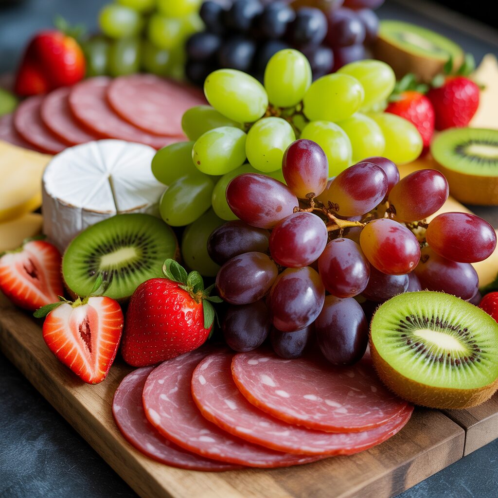 Add red and green fruits like grapes, strawberries, and kiwi. Bright colors pop against the meats and cheeses, adding freshness and vibrancy.