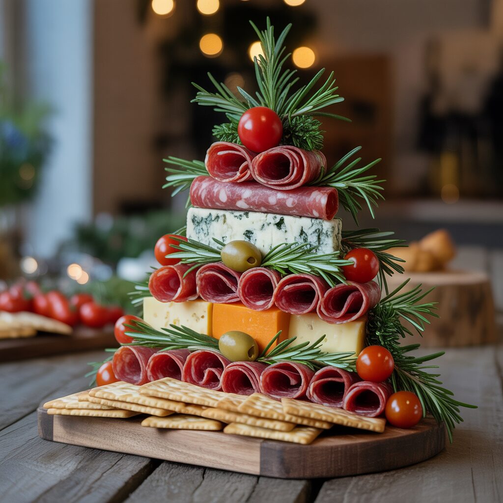 Arrange your charcuterie items in a triangular shape to mimic a Christmas tree. This simple structure creates an instant festive focal point on any table.