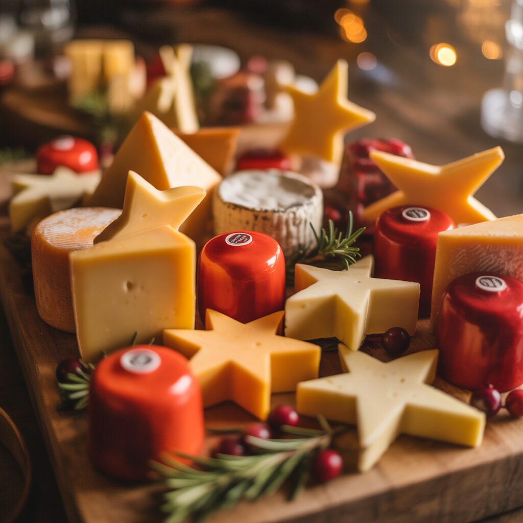 Incorporate cheeses in various shapes and colors. Red and yellow cheeses, or cheese cutouts in star and ornament shapes, enhance the holiday theme.