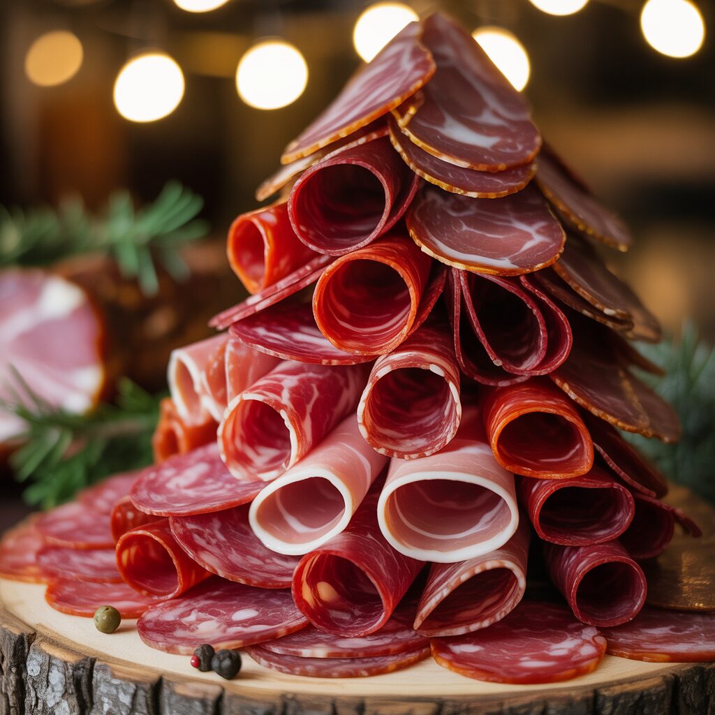Arrange sliced salami, prosciutto, or pepperoni in layers to resemble tree branches. Rolled or folded slices add dimension and visual interest.
