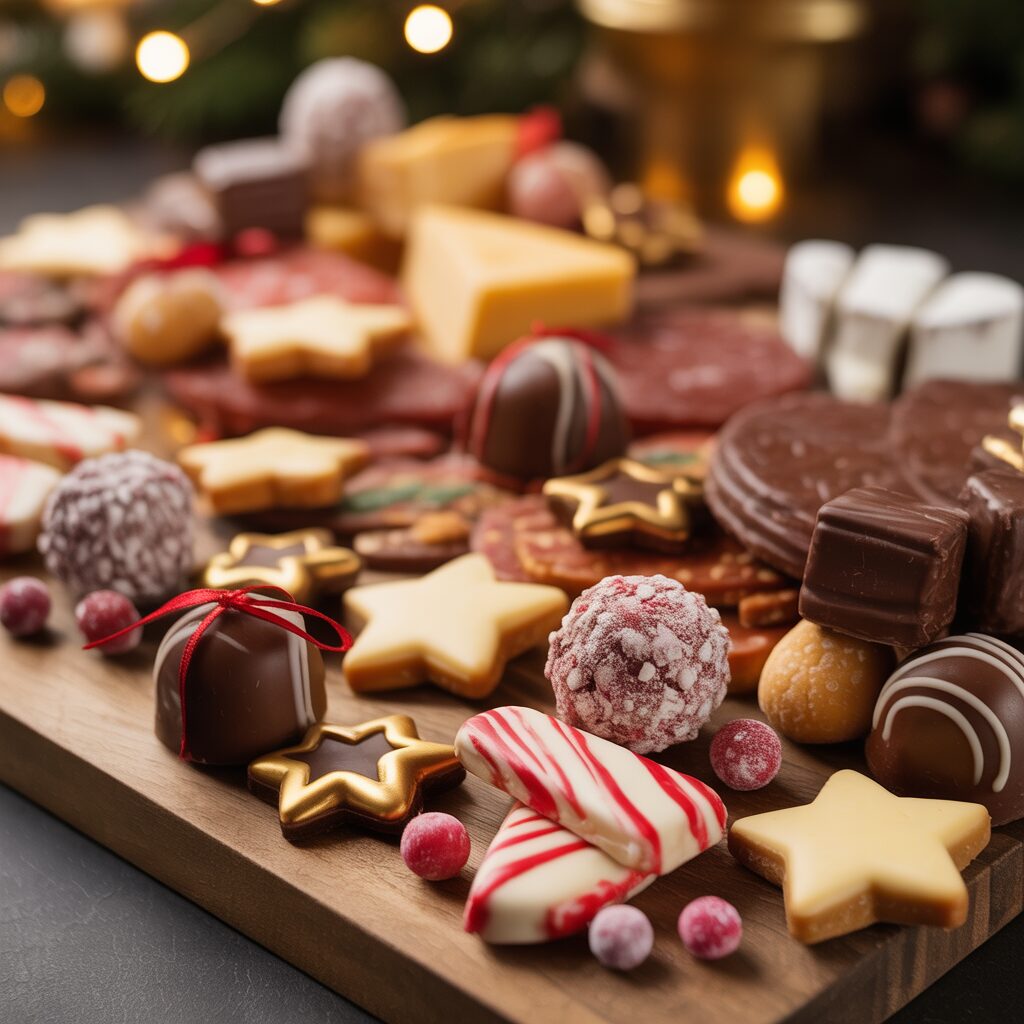 Include holiday candies, chocolate stars, or cookie ornaments. Sweet touches make the board playful and add variety for guests with a sweet tooth.