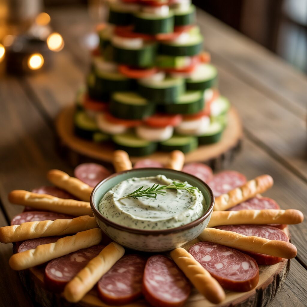 Use a small bowl of dip, breadsticks, or a sturdy sausage to represent the tree trunk. This detail completes the Christmas tree look and adds functionality.