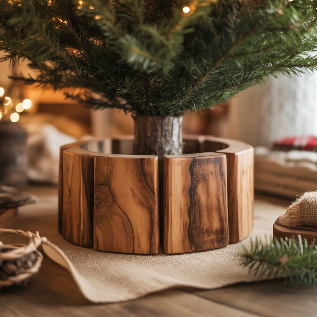 A wooden tree collar adds warmth and a natural feel. Its rustic texture complements farmhouse or woodland-themed décor beautifully.