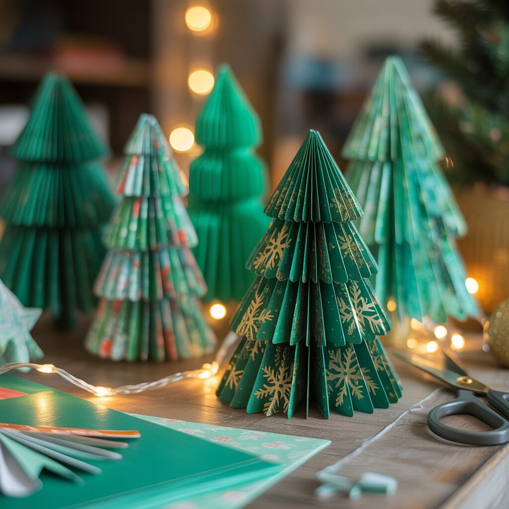Create trees using colored paper or cardstock. Fold, cut, and layer paper for simple yet charming DIY decorations.