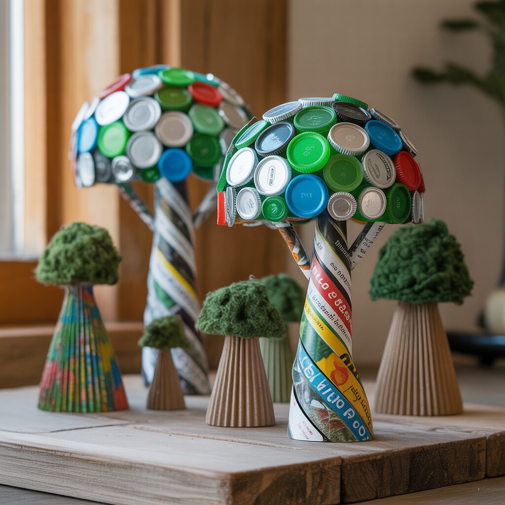 Make trees from old magazines, bottle caps, or cardboard. Eco-friendly crafts are creative, sustainable, and budget-friendly.