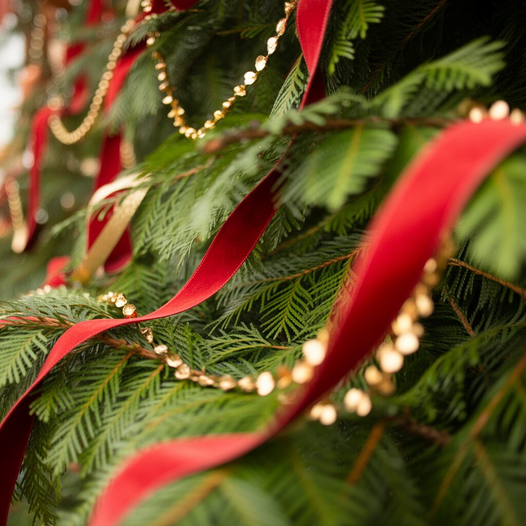 Use ribbons or garlands to weave through the branches. They add color, texture, and movement while filling empty spaces.