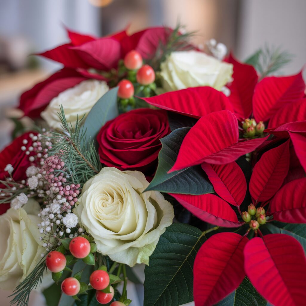 Add poinsettias, roses, or other festive flowers. Floral fillers create volume and a vibrant, eye-catching look.