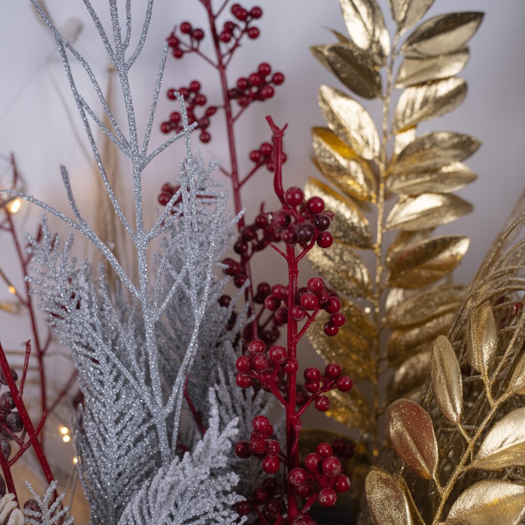 Use glittered branches, berry sprays, or metallic picks. These accents add sparkle and fill open spaces elegantly.