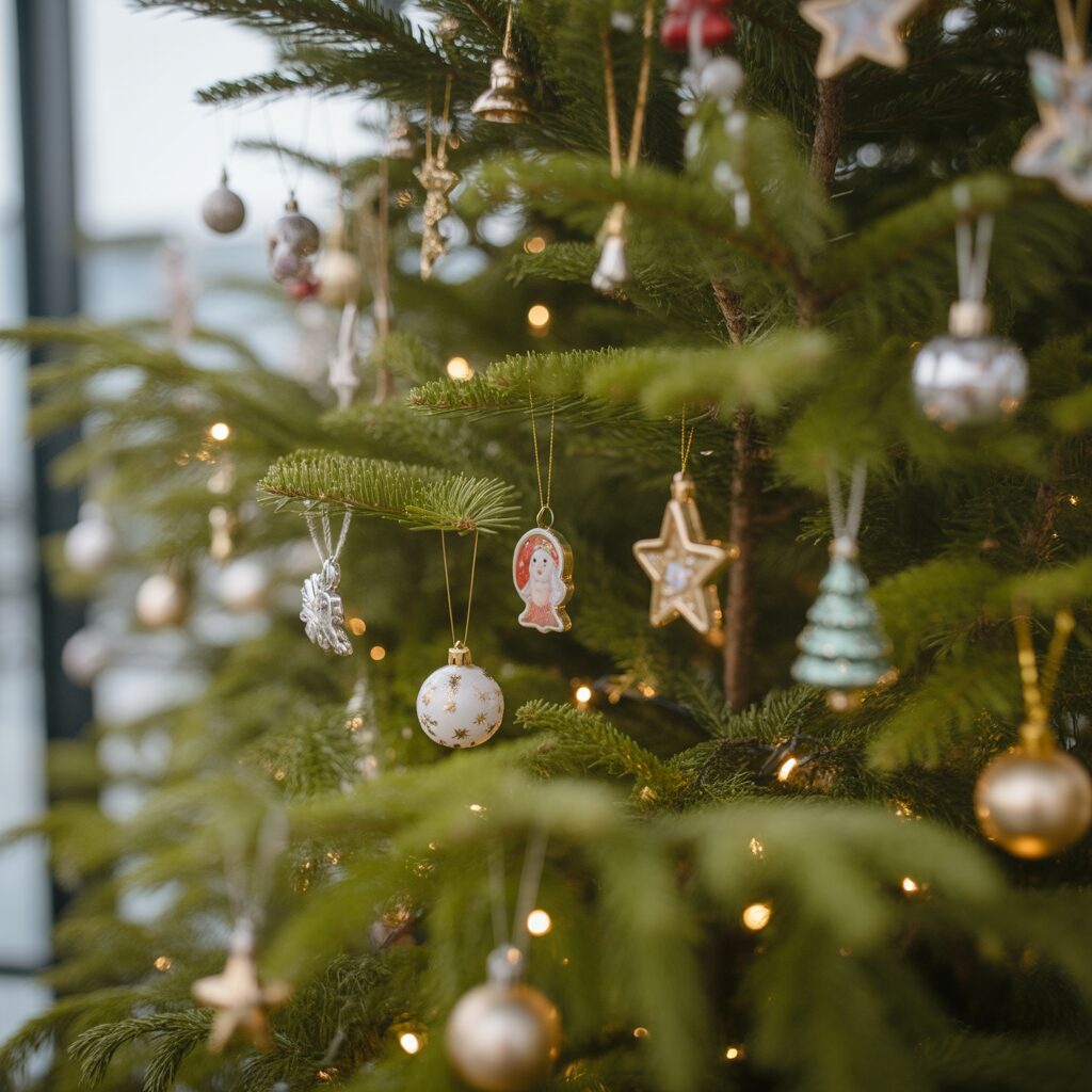 Hang mini ornaments in empty spots. Tiny baubles, stars, or themed charms complete the tree without overcrowding.