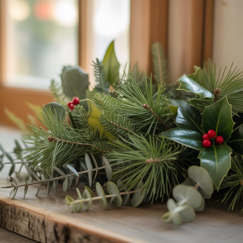 Add extra sprigs of faux pine, holly, or eucalyptus. These fillers enhance fullness and create a lush, layered effect.